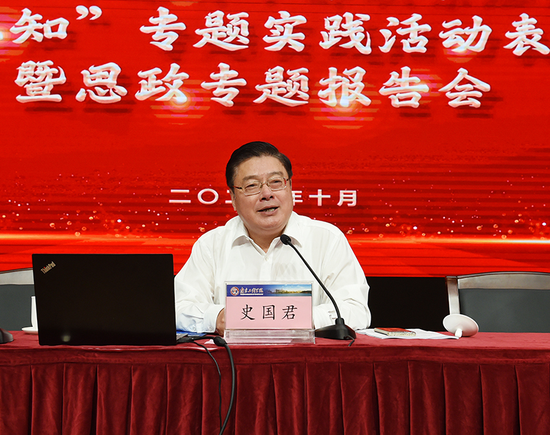 思想政治工作是党的优良传统、鲜明特色和突出政治优势,是一切工作的生命线。推进“三全育人”综合改革,是高校加强和改进思想政治工作的重要探索,我校近年来“三全育人”工作成效如何?推进“三全育人”综合改革应当坚持什么样的原则和思路?进入新发展阶段,“三进三知”专题实践活动又将如何持续深入开展?10月13日下午,校党委史国君书记以“全面深化‘三全育人’综合改革 奋力书写‘三进三知’崭新篇章”为题作思政工作专题报告。