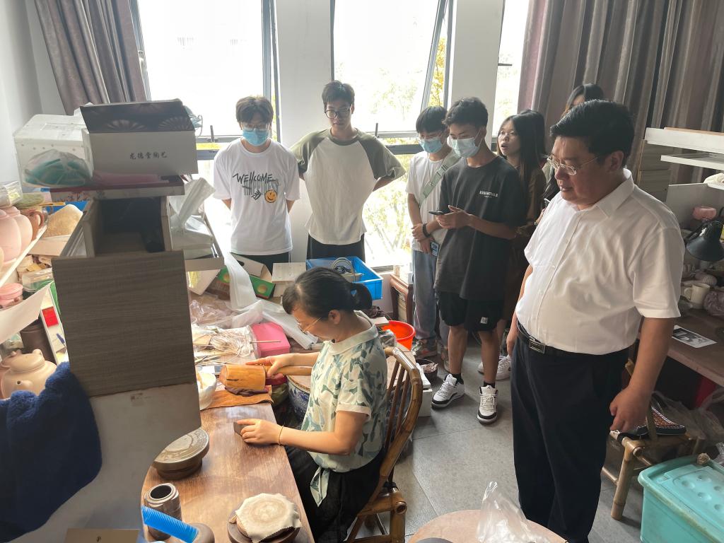 在宜兴陶瓷博物馆,周小东馆长热情接待了史书记一行。他说,作为国内最早成立的专业性陶瓷博物馆,这里展出的古陶、名人名作、紫砂、精陶、美彩陶、均陶、青瓷等精美展品都见证着宜兴悠久的制陶历史和灿烂的陶瓷文化。从宜兴的历史文化到江苏独有的宜兴“陶式生活”,从紫砂泥料到烧制工艺,周馆长给现场师生上了一堂别开生面的紫砂文史知识课,“宜兴陶瓷是历代劳动人民、匠师、紫砂艺人的伟大创造和智慧的结晶,希望同学们结合专业继承和发扬这份宝贵的艺术遗产,做未来工艺美术业的新星。”